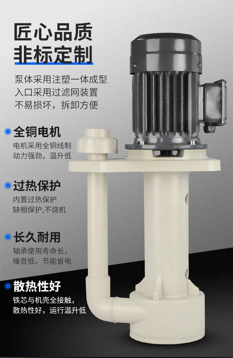 NHCN槽內(nèi)泵泵體采用FRPP PVDF材質(zhì)能耐高溫耐腐蝕雙層干式液封設(shè)計(jì),可防止馬達(dá)軸承被化學(xué)氣體侵蝕無(wú)軸封設(shè)計(jì),不會(huì)因空運(yùn)轉(zhuǎn)而損壞適合蝕刻噴洗設(shè)備.廢氣洗滌塔冷卻循環(huán)及搭配過(guò)濾器使用。